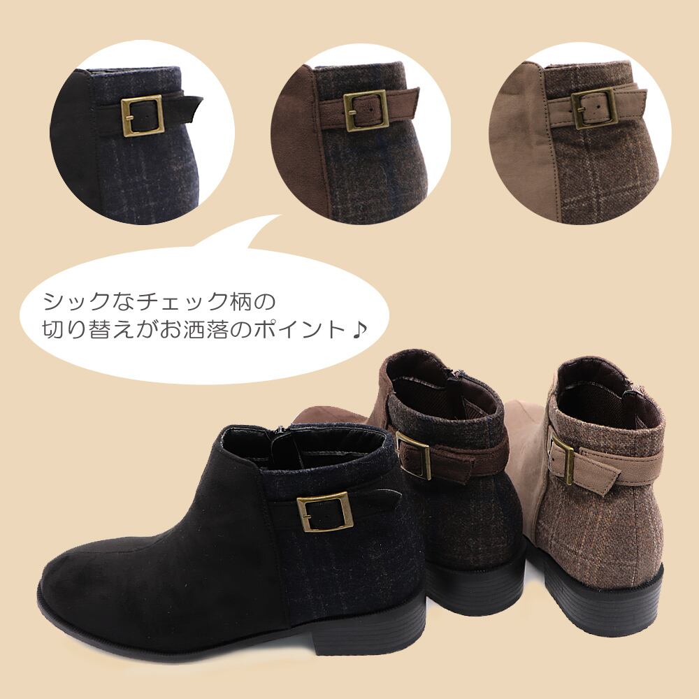 切り替えのチェック柄ベルト使いがポイントとなった後ろ姿が個性的なショートブーツ♪